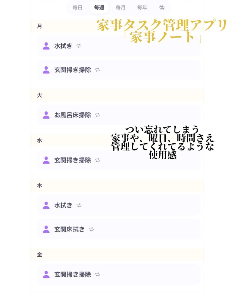 毎日や毎週、毎月のくり返し家事も設定できるから、